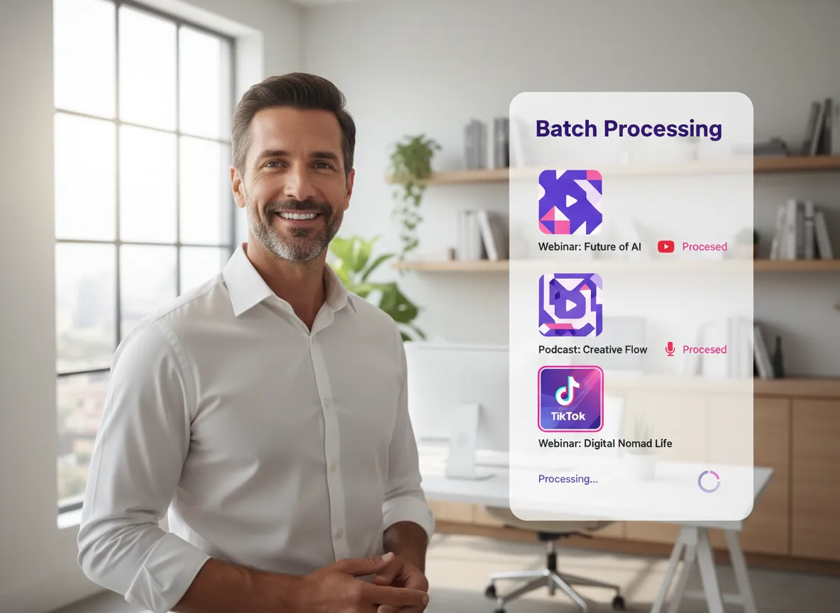 قم بتوسيع نطاق إخراج المحتوى الخاص بك باستخدام المعالجة الدفعية من Vizard. بالنسبة للوكالات والمبدعين الذين يتعاملون مع كميات كبيرة، تقوم أداة إعادة التأطير بالذكاء الاصطناعي بمعالجة مقاطع فيديو متعددة في وقت واحد عبر نسب عرض إلى ارتفاع مختلفة. يتيح لك هذا التوفير الهائل في الوقت تحويل سلسلة ندوات كاملة عبر الإنترنت إلى مقاطع جاهزة للنشر على وسائل التواصل الاجتماعي في دقائق. تتولى Vizard العمل المتكرر، مما يتيح لك التركيز على الإستراتيجية مع ضمان وصول المحتوى الخاص بك إلى كل منصة في الوقت المحدد بكفاءة.