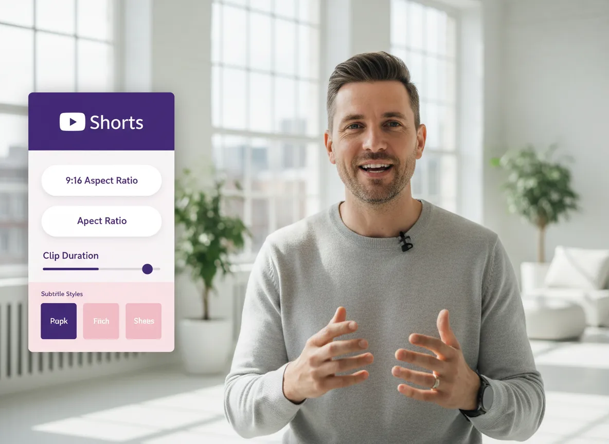 为 YouTube 短视频选择 9:16 的宽高比。设置你想要的剪辑时长,选择字幕样式,并切换 AI B-roll 或品牌模板。