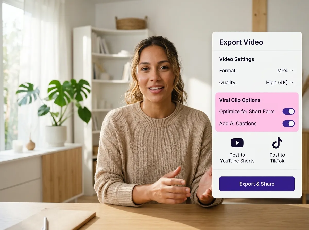 Jakmile budete spokojeni, exportujte své vyleštěné video ve vysoké kvalitě nebo jej přeměňte na virální krátké klipy připravené pro platformy sociálních médií.
