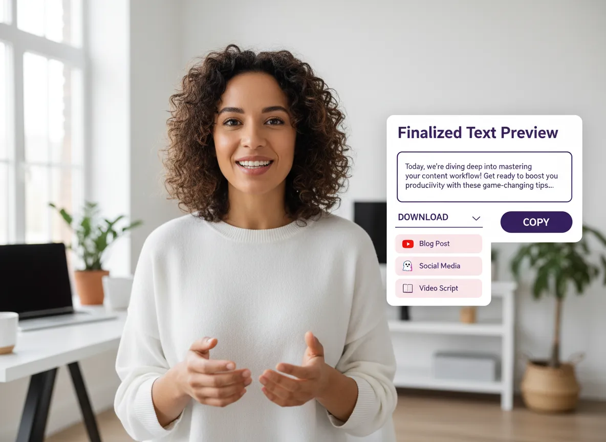 Zkopírujte svůj finalizovaný text nebo si jej stáhněte v různých formátech, abyste mohli snadno znovu použít svůj obsah pro blogy, příspěvky na sociálních sítích nebo skripty.