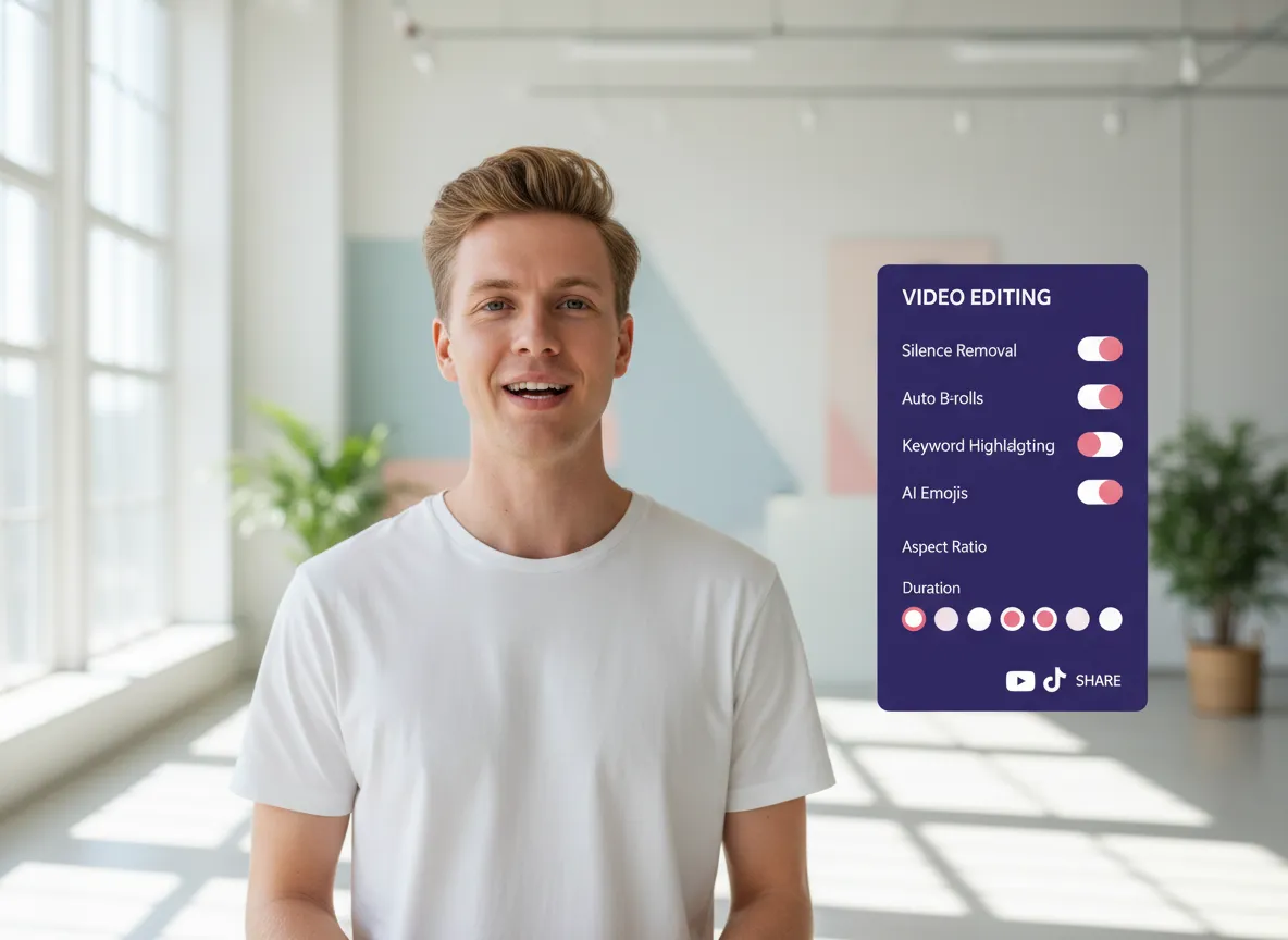 Konfigurer dit ideelle output ved at vælge billedformat, videovarighed og skabelonstil. Boost dit indhold med kraftfulde AI-funktioner - aktiver 'fjern stilhed', automatisk genererede B-rolls, fremhævelse af søgeord eller AI-drevne emojis for at få dine højdepunkter til at skille sig ud.
