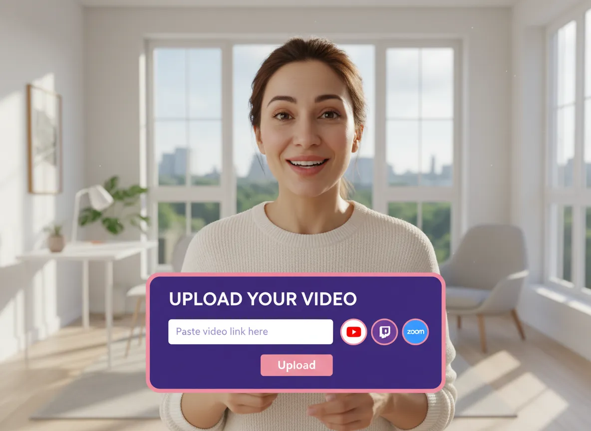Start med at logge ind på dit Vizard-arbejdsområde. Indsæt et link fra YouTube eller Twitch, upload lokale filer fra din enhed, importer direkte fra Zoom, eller optag originalt indhold direkte inde i Vizard-platformen.