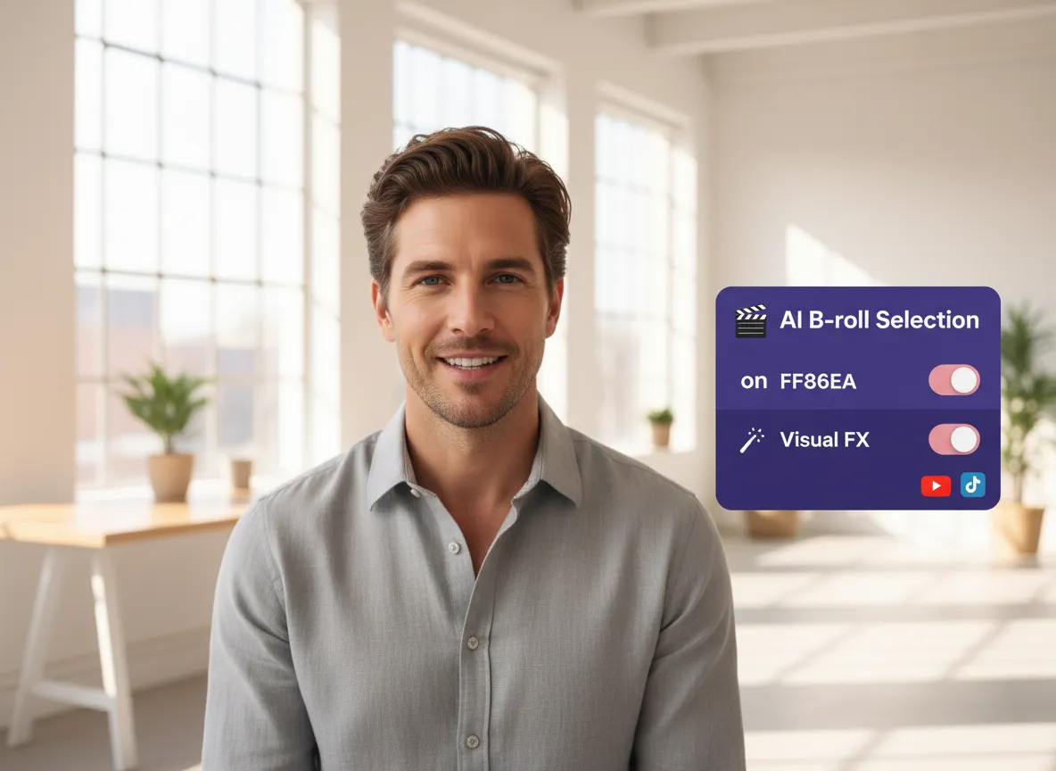 Steigere deinen Produktionswert. Vizard fügt automatisch relevante B-Rolls und visuelle Effekte hinzu, um deine Inhalte visuell anregend und professionell zu halten.