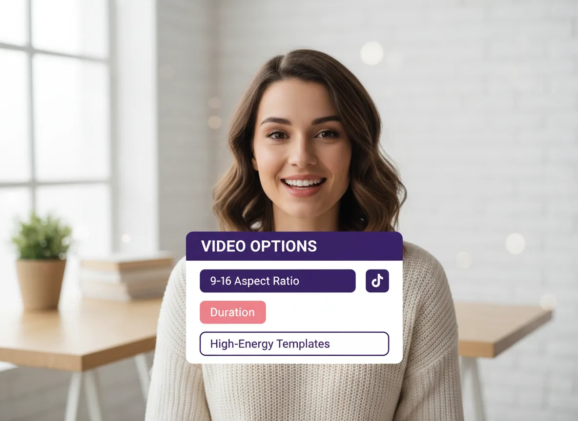 Wähle das vertikale Seitenverhältnis 9:16 speziell für TikTok. Wähle deine bevorzugte Videolänge und einen energiegeladenen Vorlagenstil, der zu deiner Marke passt.