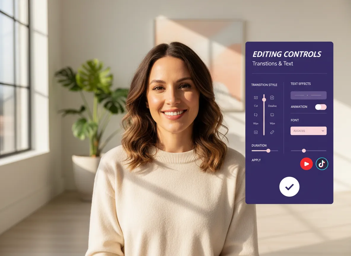 Benötigst du mehr Präzision? Greife auf den umfassenden Video-Editor von Vizard zu, um Übergänge, Text und Effekte manuell zu optimieren und ein perfekt ausgefeiltes Endprodukt zu erhalten.