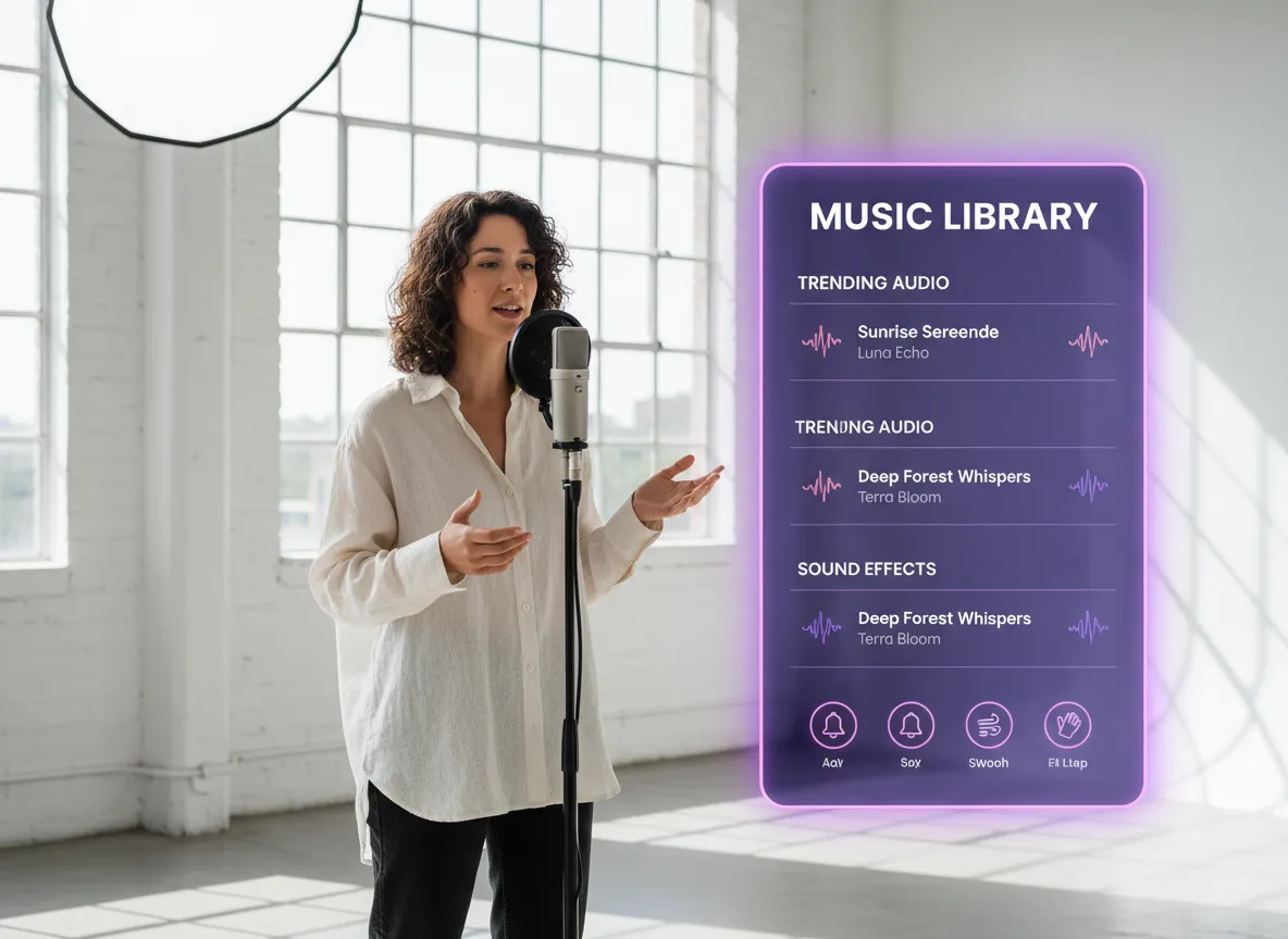 Sorge mit einer Bibliothek trendiger Audioinhalte für die richtige Stimmung. Füge Hintergrundmusik und Soundeffekte hinzu, die deine Inhalte ergänzen und dein Publikum fesseln.
