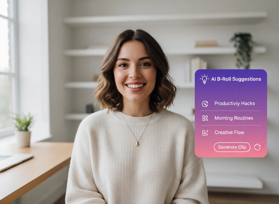 Paranna tarinankerrontaasi Vizardin ehdottamilla kontekstiin sopivilla B-roll-kuvilla. Tekoälymme lisää automaattisesti puhettasi vastaavaa materiaalia, tai voit käyttää Vizardin AI Studiota luodaksesi mukautettuja leikkeitä lennossa täyttämään visuaalisia aukkoja.