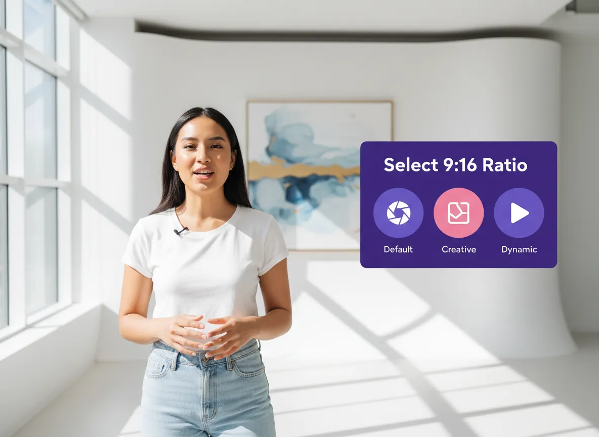 Valitse 9:16 (Pysty) tulostussuhteeksi. Voit myös määrittää halutun videon keston ja valita brändiisi sopivan ammattimaisen mallityylin.