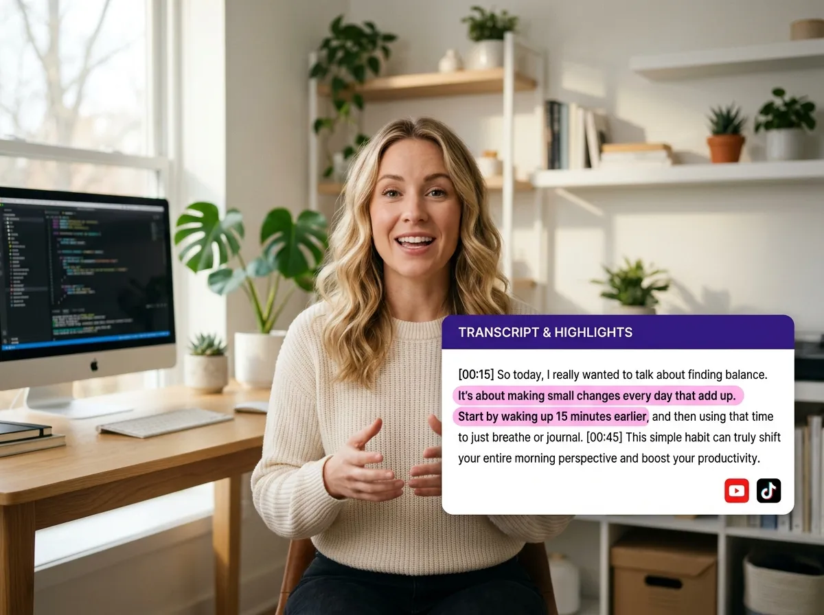 Vizard का ट्रांसक्रिप्ट-आधारित इंटरफ़ेस पॉडकास्ट और इंटरव्यू के लिए संपादन को सरल बनाता है। हमारा लाइवस्ट्रीम क्लिप मेकर सटीक ट्रांसक्रिप्ट उत्पन्न करता है, जिससे आप टेक्स्ट को हाइलाइट करके वीडियो संपादित कर सकते हैं। YouTube Live या Zoom रिकॉर्डिंग से बिना किसी प्रयास के साइलेंस को हटा दें। यह क्रिएटर्स के लिए LinkedIn और Instagram के लिए एक जटिल टाइमलाइन के बिना साफ, पंच वाली क्लिप बनाने का सही तरीका है।