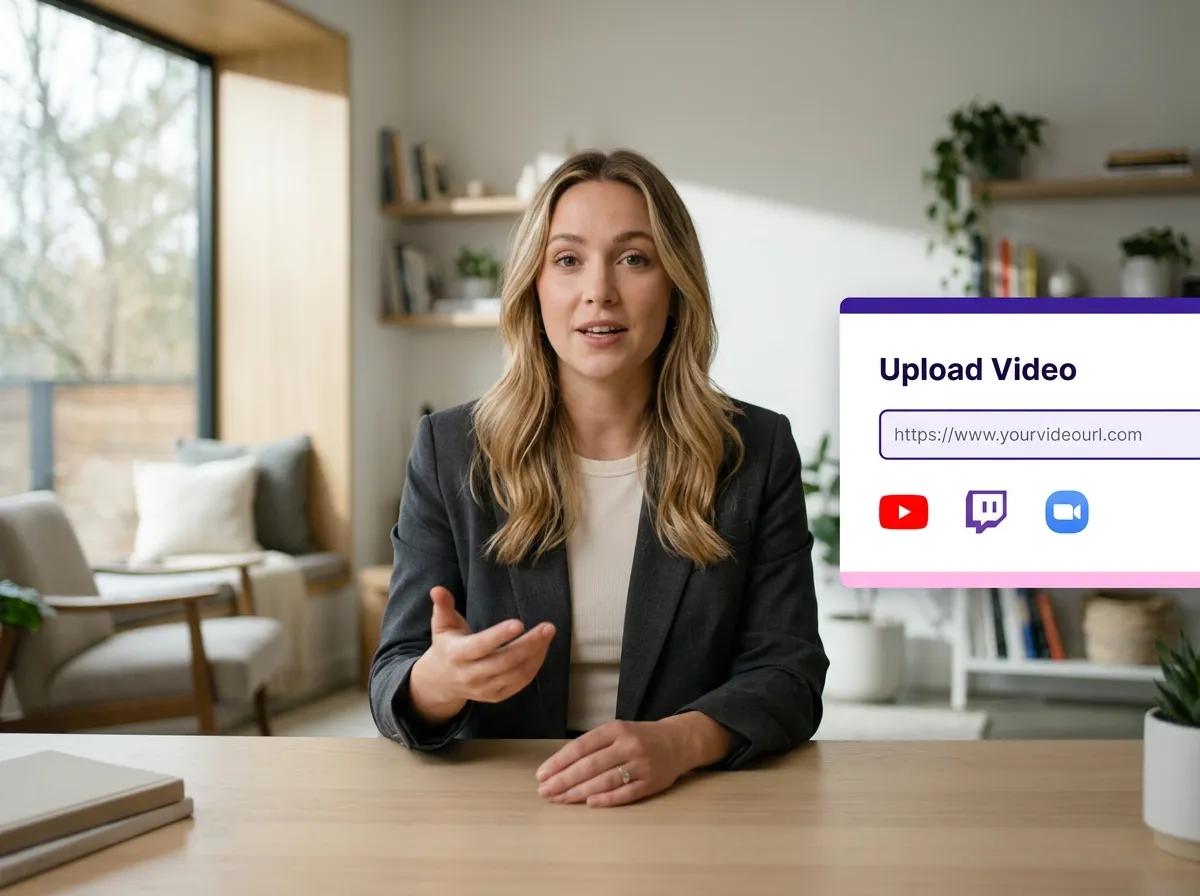 सीधे अपनी लाइवस्ट्रीम वीडियो फ़ाइलों को अपलोड करके या YouTube, Twitch या Zoom से एक URL पेस्ट करके शुरुआत करें। Vizard लंबी-फॉर्म रिकॉर्डिंग को इम्पोर्ट करना आसान बनाता है ताकि आप सेकंडों में पुन: प्रयोजन प्रक्रिया शुरू कर सकें।