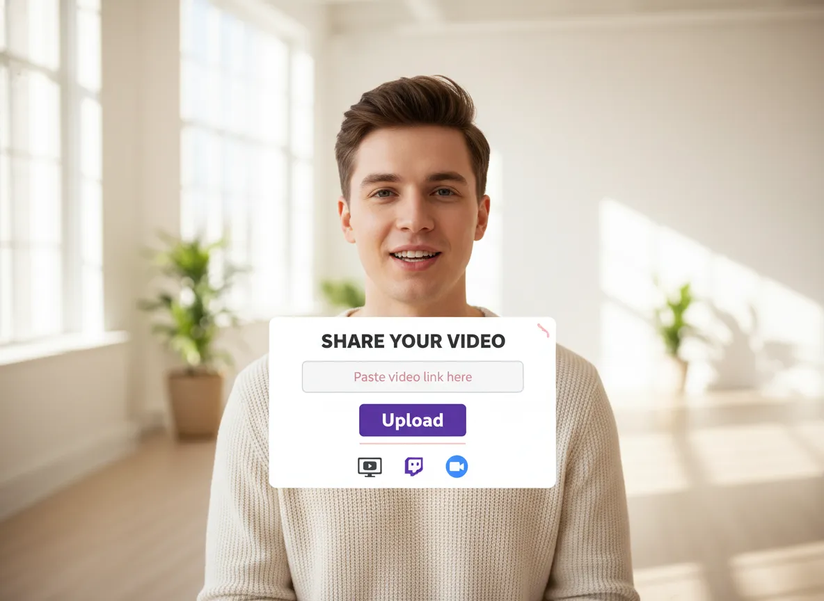 Prijavite se na svoj Vizard radni prostor i lako otpremite svoje video datoteke ili jednostavno nalepite vezu sa YouTube-a, Zoom-a ili Twitch-a da biste započeli.